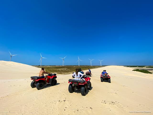A jornada começa com uma emocionante pilotagem por trilhas off-road, atravessando a vegetação de restinga que caracteriza a região. A primeira parada permite apreciar a natureza selvagem ao redor, com a rica fauna e flora dos Lençóis Maranhenses. Seguimos pelas impressionantes dunas dos Pequenos Lençóis até o Parque Eólico de Caburé, passando pela Trilha dos Caetés e pela Lagoa do Alazão. Nesse trecho, faremos paradas estratégicas: uma em uma lagoa cristalina para um mergulho refrescante e outra no Parque Eólico, onde você poderá tirar fotos incríveis junto aos gigantescos aerogeradores que contrastam com o cenário natural.